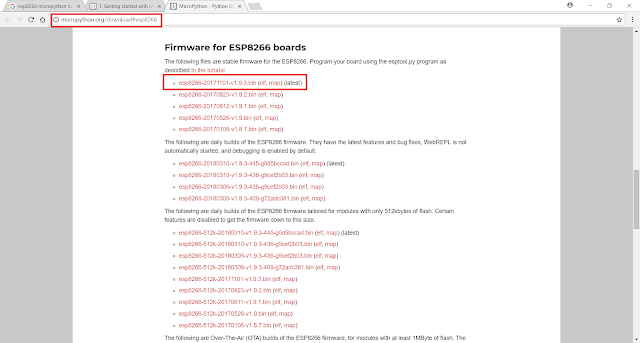 Go to this URL (http://micropython.org/download#esp8266) [4] and download firmware. It is recommended to use latest and stable builds, not daily and experimental ones. Save the firmware file (.bin) that’ll be flashed into the device to a known folder in your PC.