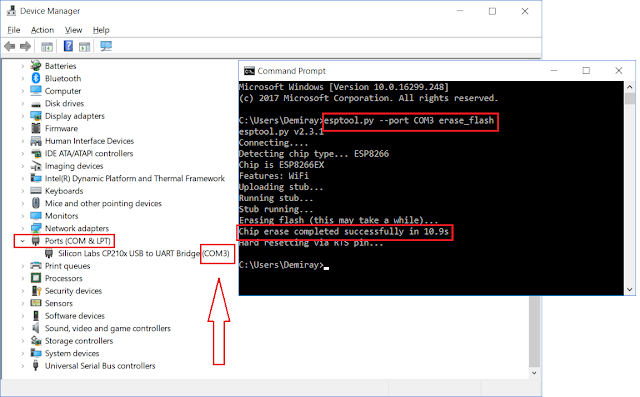 Now that we have “esptool.py” installed on our local PC, we can use it to copy the firmware file we downloaded onto the chip. Before writing firmware to the flash memory of the chip, whole flash memory should be erased. To erase the flash of the chip, use below command by noting that COM number of your device might be different in your PC. Just replace it with the correct COM number.