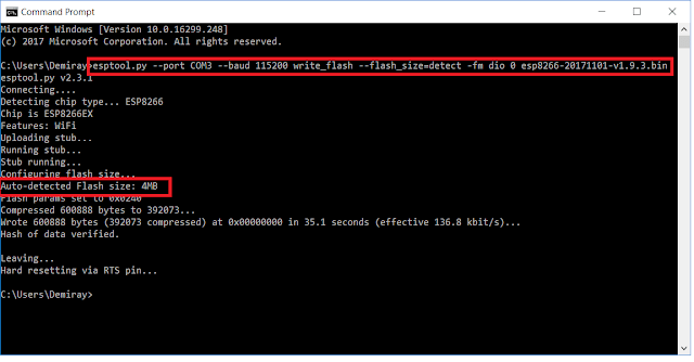 esptool.py –port COM3 –baud 115200 write_flash –flash_size=detect -fm dio 0 FirmwareSw.bin