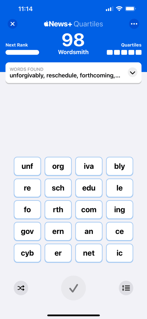 I woke up, opened up daily puzzle (Quartiles) that is posted on Apple News+ on my phone and starting seeing words like:
